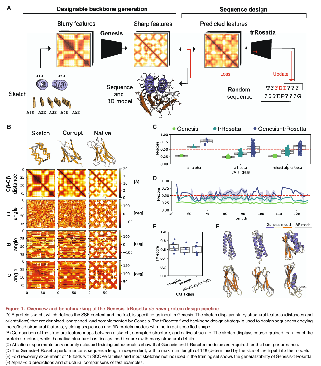 참고로, 인공지능 논문에도 매번 등장하는 ablation study를 randomly selected 273 folds에 대해 수행했을 때, Genesis, trRosetta, both에서 나온 결과를 원래의 구조와 aligning 해보는 self-consistency TM score를 보면 Genesis-trRosetta를 사용하는 protocol이 전반적인 성능이 가장 좋다는 것을 확인할 수 있다. 추가로 아래 figure 1.E-F를 살펴보면, 이 framework가 traning set에 포함되지 않은 SCOPe (Structural Classification of Proteins-extented) family에 대해서도 일반화된 좋은 예측을 보여주고 있음을 확인 가능하다.