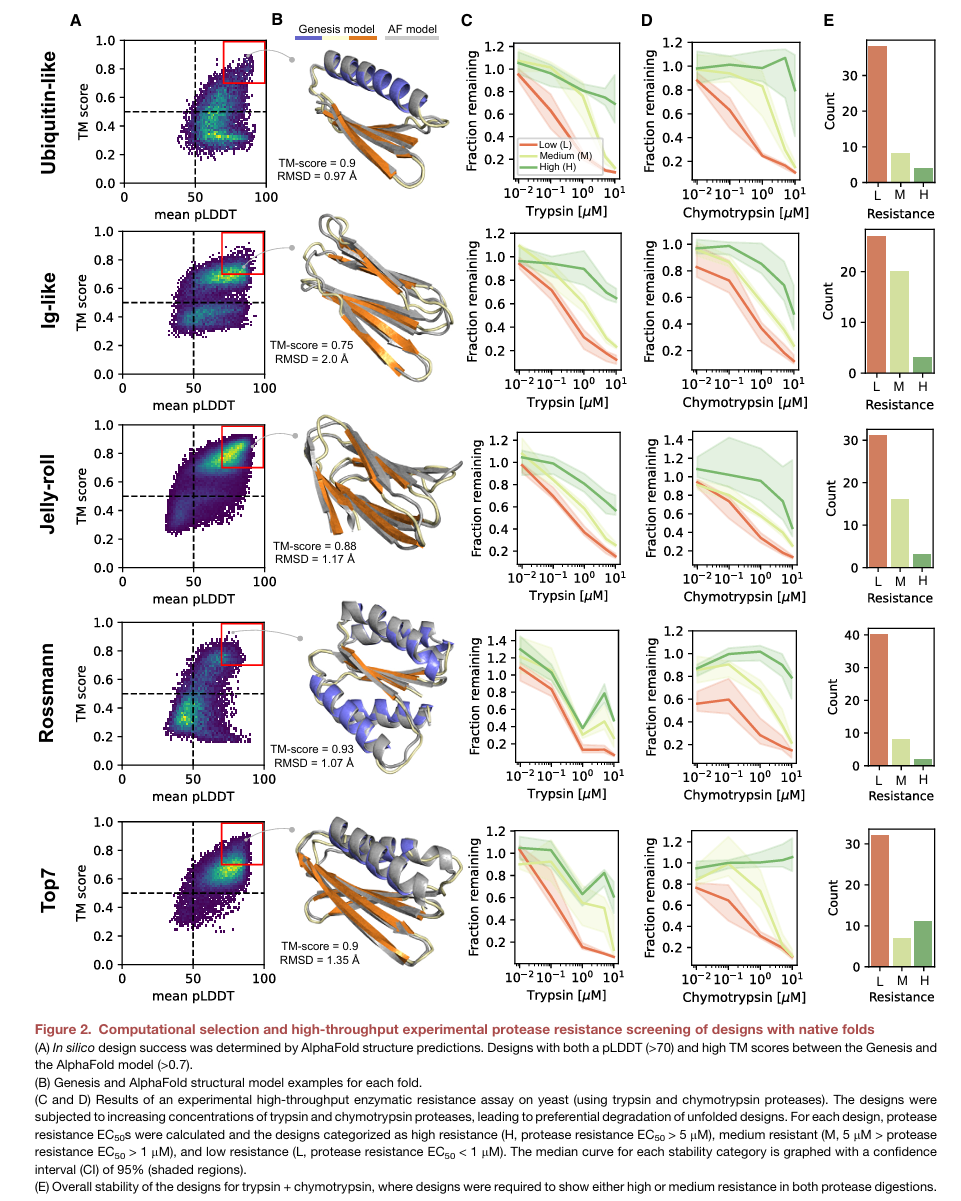 3) Genesis는 native folds는 물론, “dark-matter” folds에 관해서도 일반화되게 distance and angle distribution을 잘 구성하였다 (proteases resistance를 이용해 안정성 검증).