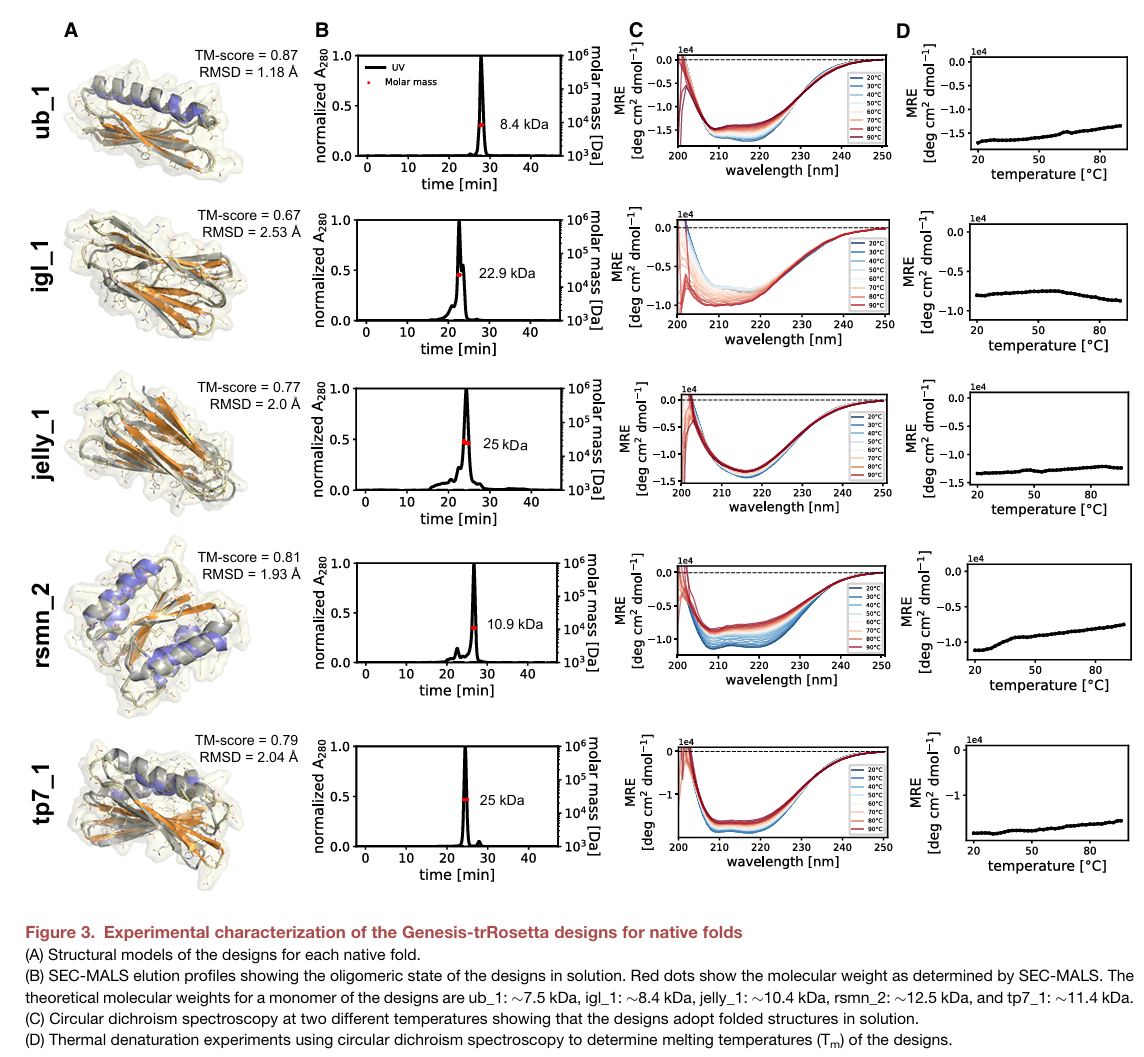 아래의 figure 3에서 3-B는 SEC-MALS (Size-Exclusion Chromatography - Multi-Angle Light Scattering)의 결과로 peak의 수와 분자량 등을 확인하기 위해 확인하는 것이다. 5 종류의 fold의 대표 design들에서 모두 peak의 분포가 하나인 것을 확인할 수 있다 (monodisperse). 다만, ub_1의 경우 이론적인 질량 (~7.5kDa)과 측정한 질량이 비슷하지만, igl_1의 경우 2배 이상 차이 나는 것을 보아 oligomer 형태로 존재하는 것을 예상할 수 있다. Figure 3-C는 circular dichroism spectroscopy의 결과로 secondary structure에 민감하게 작동하는 분광현미경의 결과인데, 각 온도 변화에 대해 점진적이고 비슷한 패턴을 보이는 것을 통해 solution 상에서 folding을 잘 이루고 있다는 것을 확인할 수 있다. 마지막 3-D는 동일한 spectroscopy로 melting temperature를 확인하는 것이다.