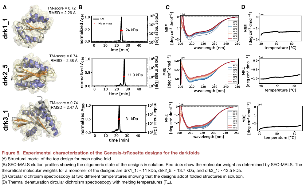 아래의 Figure 5에서는, best designs에 대한 purification과 biochemical characterization의 결과를 보여준다. 논문의 supplementary에는 좀 더 많은 design들에 대한 결과를 포함하고 있는데, 꽤 많은 design에서 설계한 sketch에 맞는 CD spectrometry 결과를 보이면서, 높은 thermostability를 가지고 있는 것을 확인할 수 있었다. 즉, 이 결과들로부터 Genesis-trRosetta framework가 학습에서 포함되지 않은 novel folds에 대해 일반화되며, nature에서 발견되지 않은 folds에 대해서도 backbone generation과 sequence search가 가능하도록 구조적인 패턴을 학습했다는 것을 제시하고 있다.