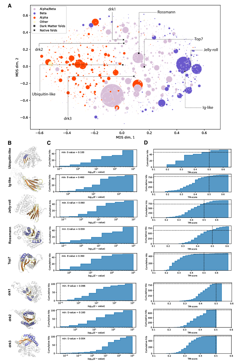 Designed protein sequences들이 알려진 protein domain에 대해 얼마나 구조적으로 유사한지를 확인하기 위해서, 본 연구에서 얻은 native & darkfold 각각의 representative model이 모든 CATH domain representative와 TM-align algorithm을 통해 aligned 되었다. 그 결과로 나온 TM score similarity matrix가 classical multidimensional scaling에 의해 2D plot으로 mapping된 결과가 아래의 Figure 6-A이다. 그림을 살펴보면, nature folds와 달리 dark folds의 경우 CATH domain에 속하지 않고 분리되어 있는 것을 확인할 수 있다.
